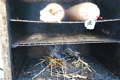Summer sausage is a pretty quick process. Grind and mix your meat. Ferment for several days (in this case, only 1 day so we didn't over sour its delicate flavour). Smoke slowly till you reach the optimum internal temperature.